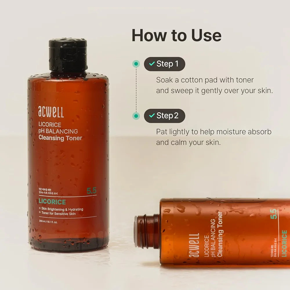 The Acwell Licorice pH Balancing Toner is a gentle Korean toner formulated with licorice root extract and an amino acid complex to cleanse, balance, and calm the skin. It maintains an ideal pH level of 5.5–6, helping to reset the skin after cleansing while controlling excess oil and supporting a healthy skin barrier.