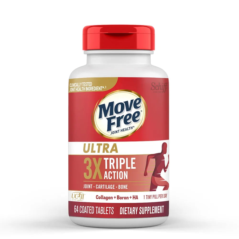 Move Free Ultra Triple Action delivers comprehensive joint care in just one small tablet a day. Powered by Type II Collagen, Boron, and Hyaluronic Acid, this formula supports joint comfort, helps maintain healthy cartilage, and strengthens bones — all without the need for multiple pills.
