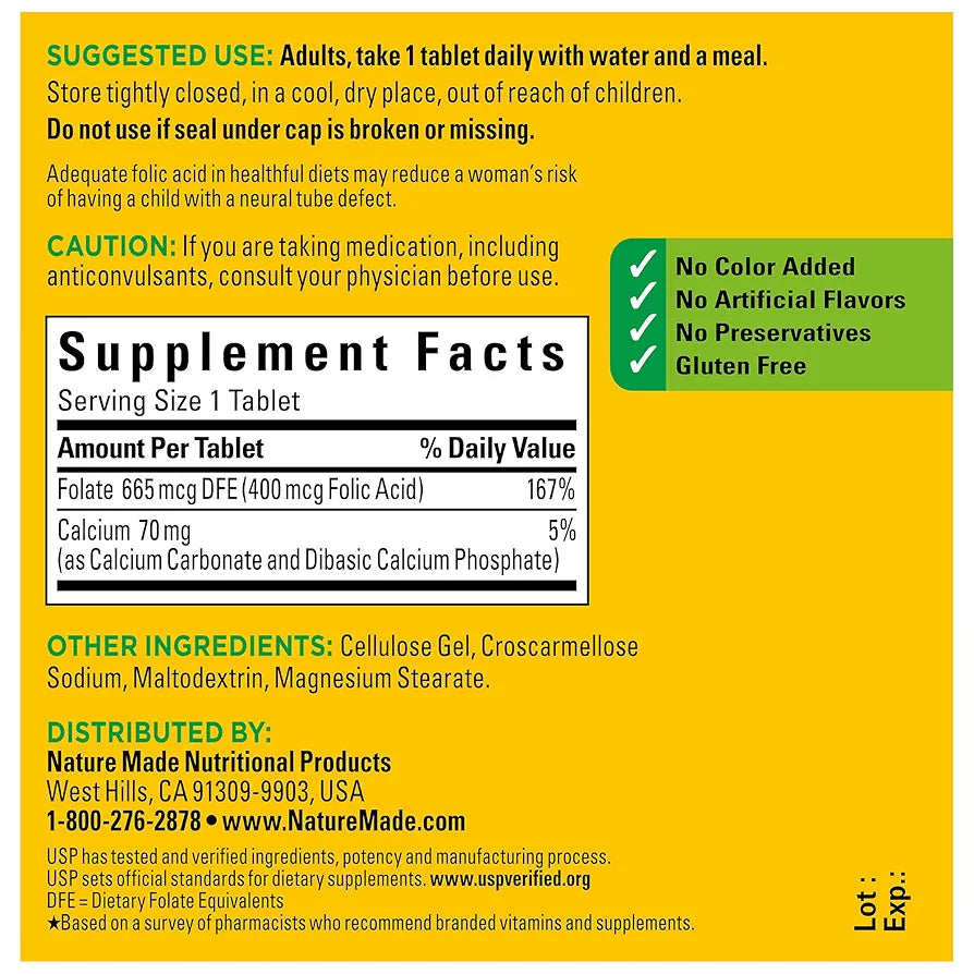 Nature Made Folic Acid 400 mcg, Dietary Supplement for Nervous System Function & Pregnant/TTC women. 250 Day Supply